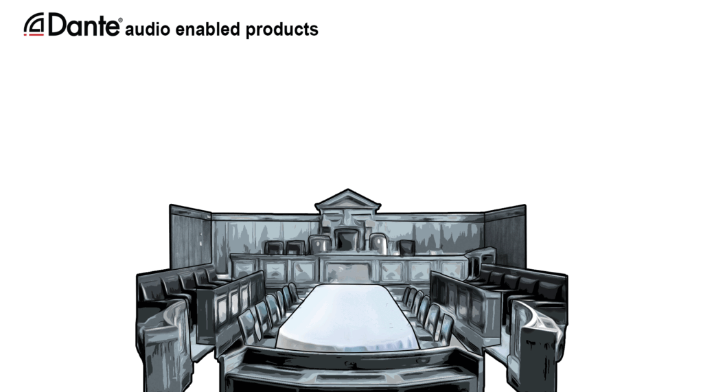 Muchos de los sistemas de debate que se usan habitualmente en ellos funcionan con Dante®. Son los mismos sistemas de debate que se integran con AREC para el seguimiento automático de cámaras, y que pueden conectarse a una unidad central, que a su vez puede conectarse al AREC LS-110 para la grabación de audio y al DS-4CU para el seguimiento automático de los oradores, todo ello por la red.