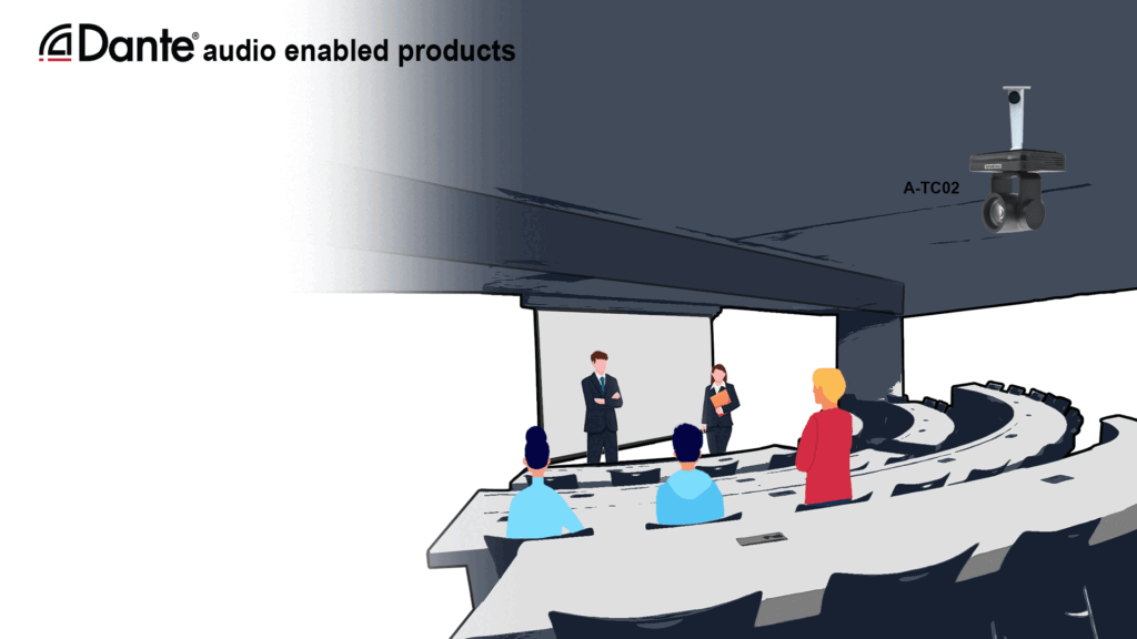 Para que esto resulte aún más cómodo para el usuario, se puede considerar usar las cámaras de seguimiento IR y AI de AREC. Diseñadas para seguir a tus conferenciantes y a los miembros activos del público, y funcionan de forma inalámbrica, lo que las convierte en un emparejamiento ideal para los dispositivos compatibles con Dante®.