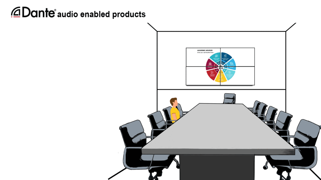 Con Dante®, la conexión entre los micrófonos y altavoces de la mesa de conferencias, los altavoces de pared, otros dispositivos de audio y una Media Station AREC se realiza con sólo un cable de red. Esto simplifica el cableado, preserva la calidad de audio y facilita el cambio de ruta de audio si cambia la configuración de la sala. Además, la conexión de red facilita la colocación del hardware lejos de la sala, dejando sólo los dispositivos necesarios en el interior.