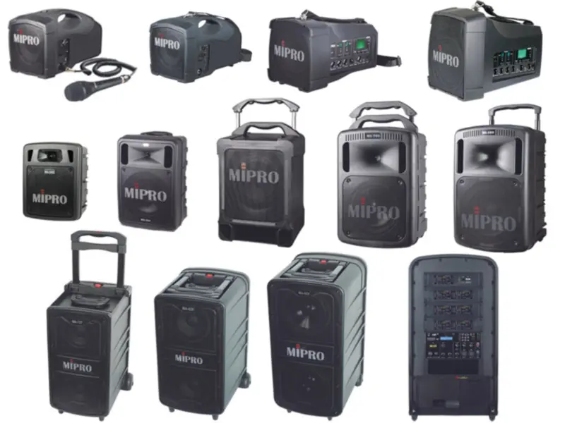 MIPRO tiene una amplia gama de altavoces portátiles de distinto tamaño y potencia, lo que te permite elegir el equipo perfecto según el tamaño de tu audiencia. Desde el básico MIPRO MA-101C que incorpora micrófono alámbrico, idal para servir como megáfono en una guía cultural, hasta el avanzado MIPRO MA-929, con 290W de potencia y listo para funcionar con un reproductor de MP3, puerto USB y ranura para tarjetas SD, módulo Bluetooth y posibilidad de instalar 8 módulos receptores de micrófono inalámbricos. Descubre los distintos modelos aquí.
